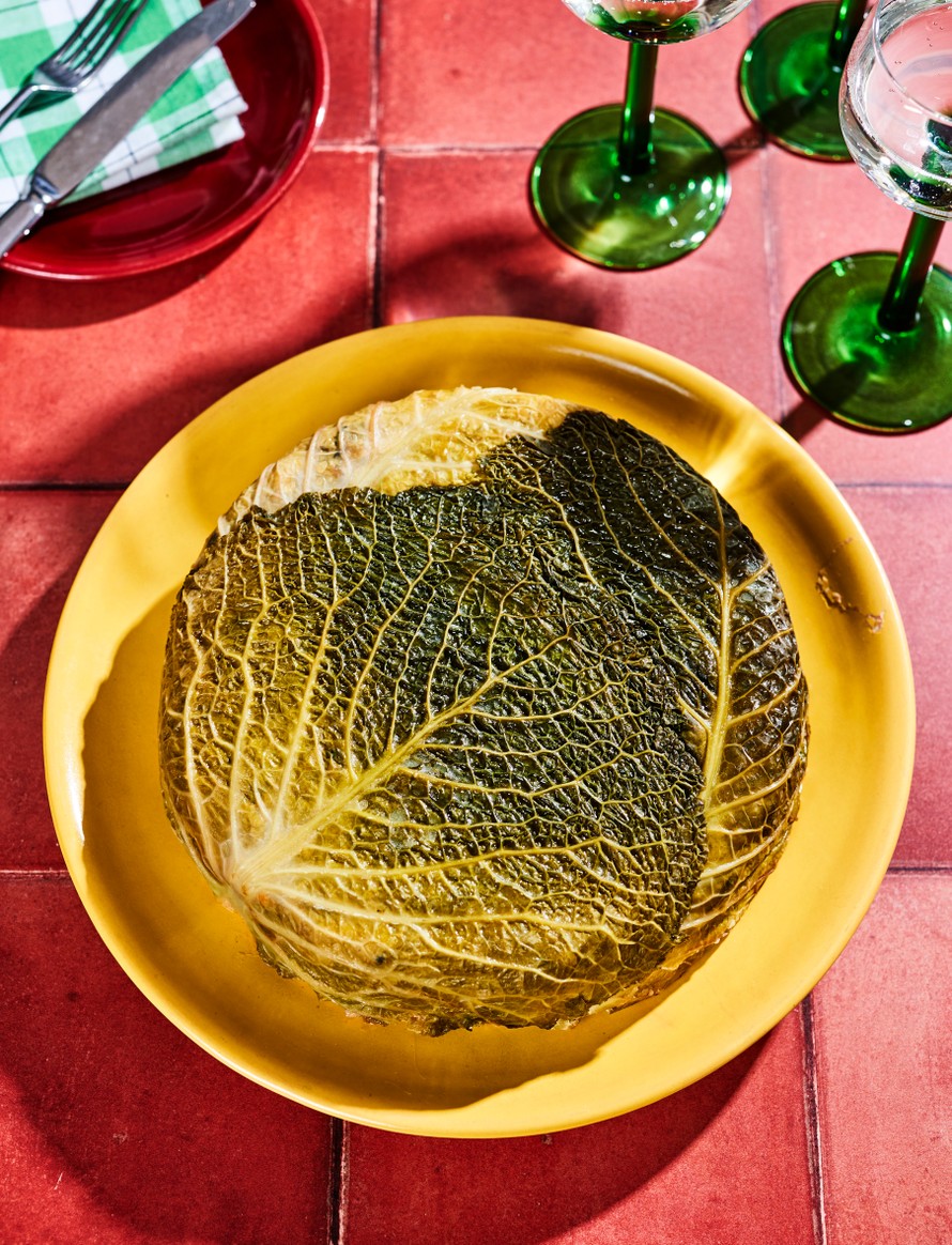 Paista 200-asteisessa uunissa 30 minuuttia. Anna jäähtyä 10 minuuttia ja kumoa kaali tarjoiluvadille.