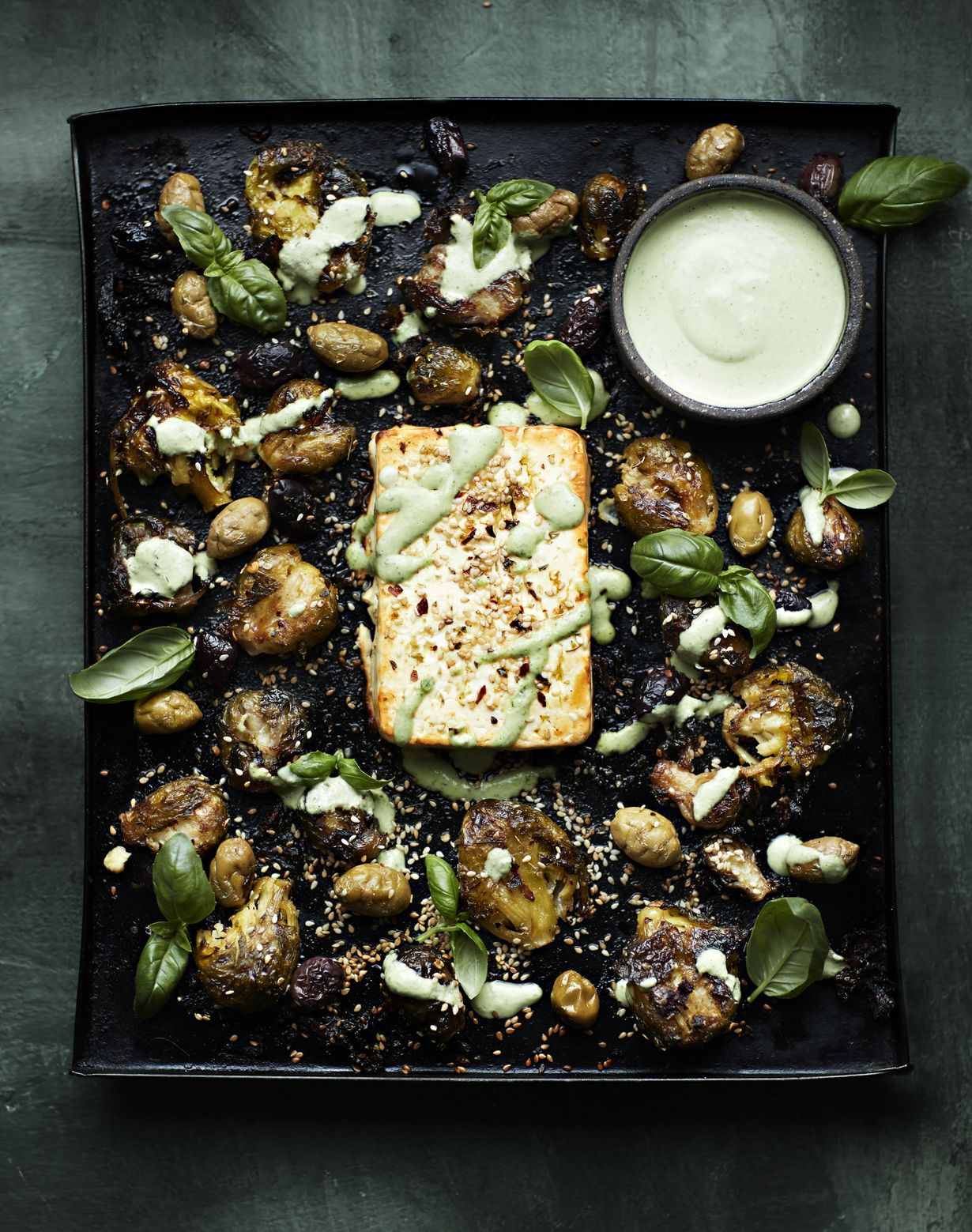 Samalle pellille voi laittaa paahtumaan kokonaisen fetapalan. Uunin pehmentämä feta ja raikas basilika-tahinikastike toimivat loistavana lisukkeena kullanruskeille ruusukaaleille. Voit dippailla rapeita ruusukaaleja pehmeään fetaan tai koota aineksia suoraan lautaselle.