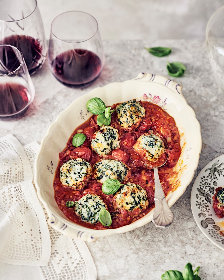 Gnudit eli ricottajuustosta valmistetut pumpulinpehmeät pallerot ovat sukua gnoccheille. Tavallisesti gnudit keitetään, mutta tässä ohjeessa ne pyöritellään isoiksi pulliksi ja kypsennetään tomaattikastikkeen syleilyssä uunissa. Lopputulos? Suussasulavan maukas ja yllättävän helppo väliruoka.