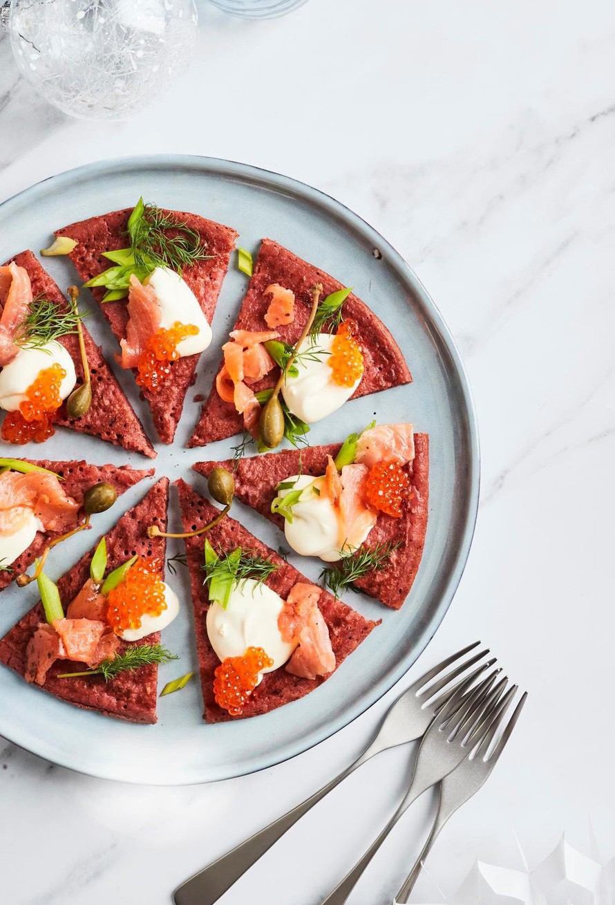 Punajuuresta ja piparjuuresta makua saava jättiblini on kätevä tarjottava. Paistat vain muutaman ja leikkaat valmiiksi pikkupaloiksi. Tästä taikinasta tulee neljä jättibliniä.