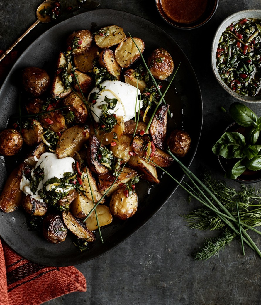 Ihanissa yrttiperunoissa ei vihreässä säästellä. Enemmän yrttejä ja sitruunaa, vähemmän suolaa!