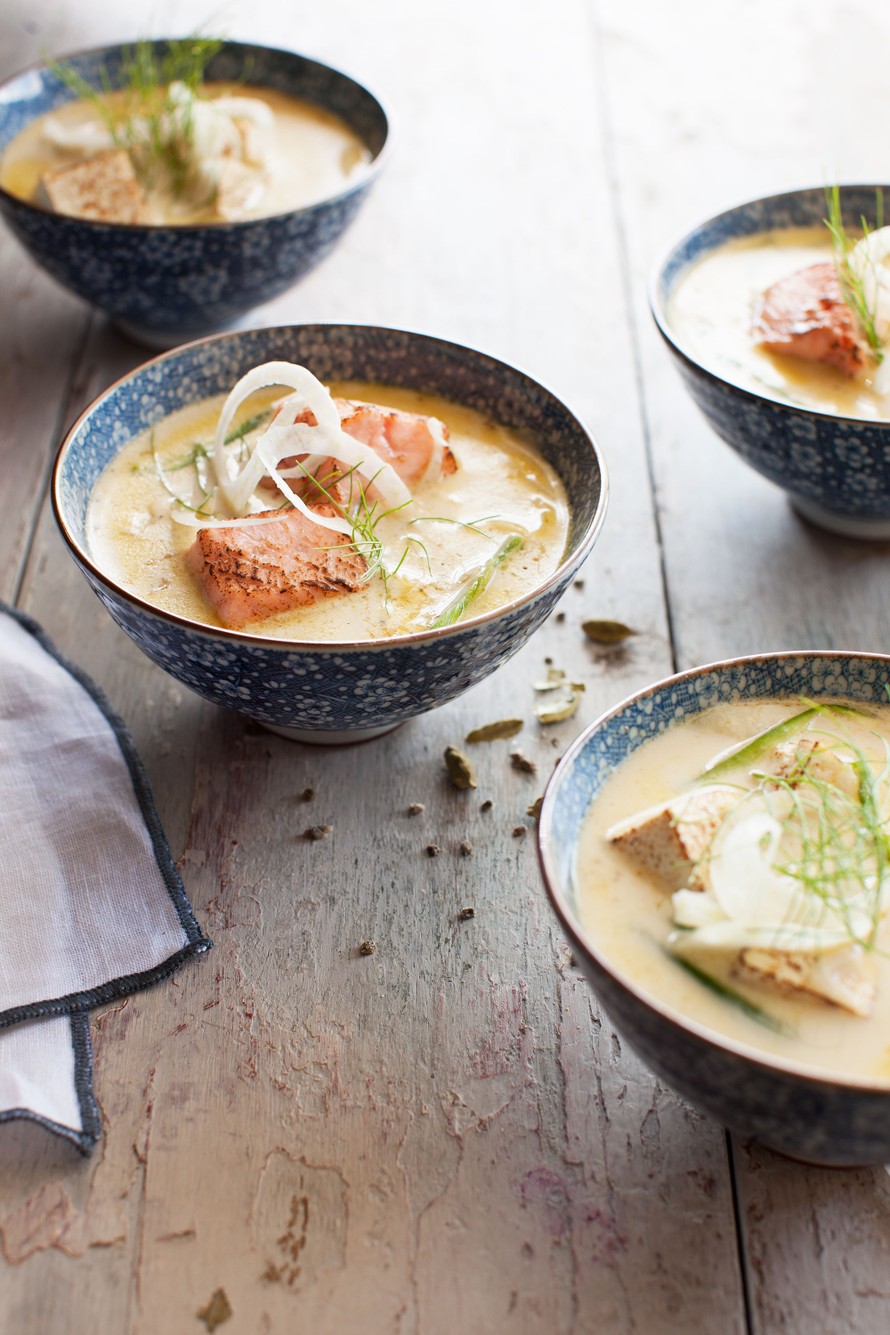 Kardemummalla ja fenkolilla maustetun kookosmaitoliemen sattumina on lohta tai tofua.