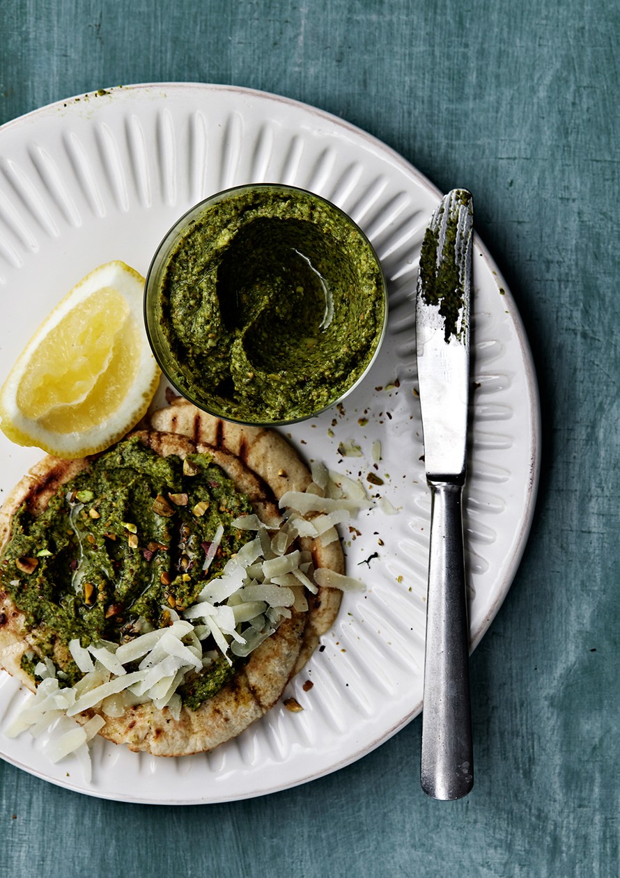 - Koristele parmesaanilla ja pistaaseilla. Viimeistele oliiviöljyllä. Tarjoa esimerkiksi tandoorileivän kanssa.