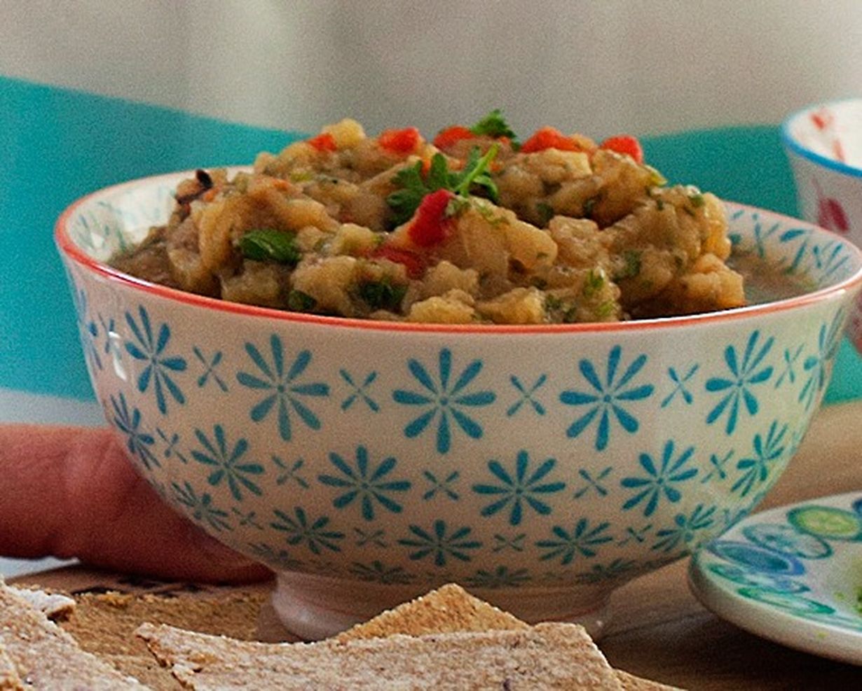 3. Kuori ja poista siemenet paprikoista, kuutioi ne ja laita kulhoon. Leikkaa munakoisot pituussuunnassa kahtia ja irrota hedelmäliha kuoresta lusikalla. Leikkaa munakoisot pieniksi kuutioiksi ja nosta ne kulhoon.