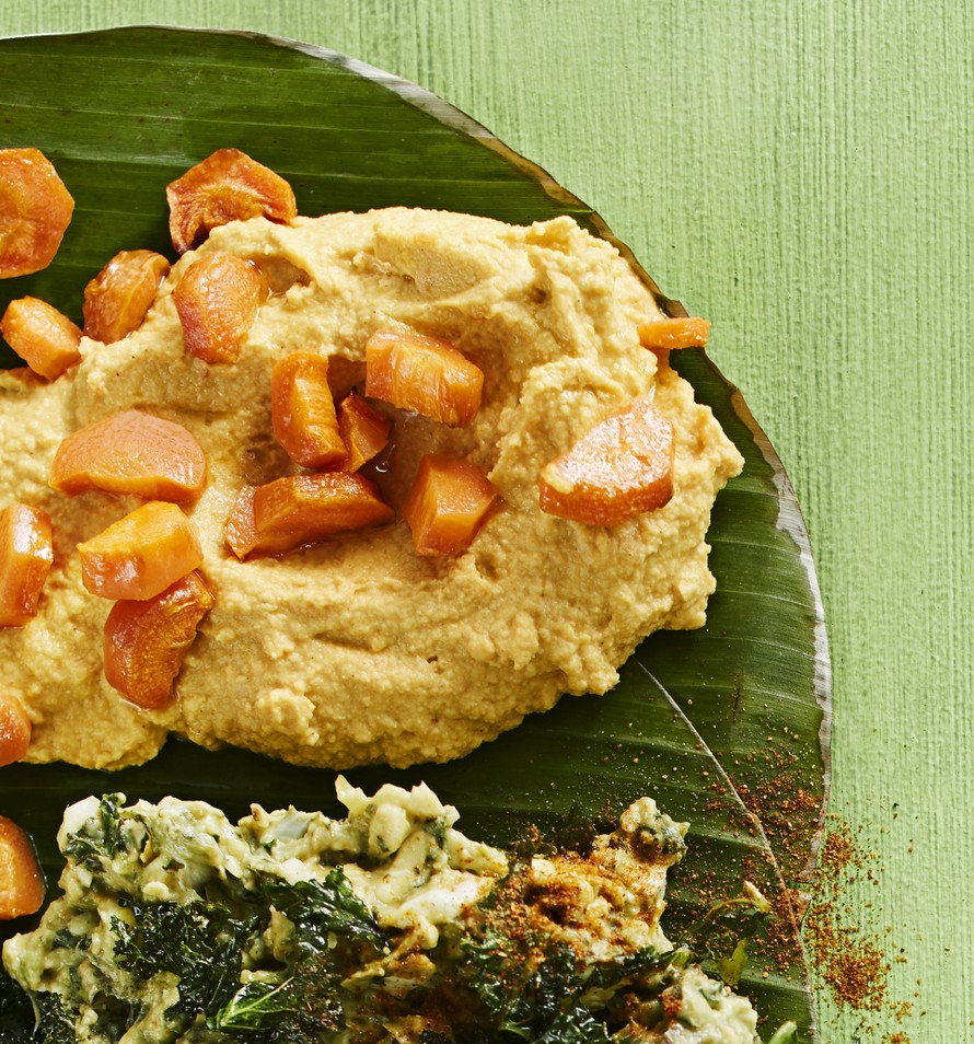 Vegaaninen porkkanahummus on tahnabaarin vetonaula. Porkkanoiden ja valkosipulien paahtaminen antaa tahnaan lempeän paahteisen maun. Tästä riittää ammennettavaa isollekin joukolle.