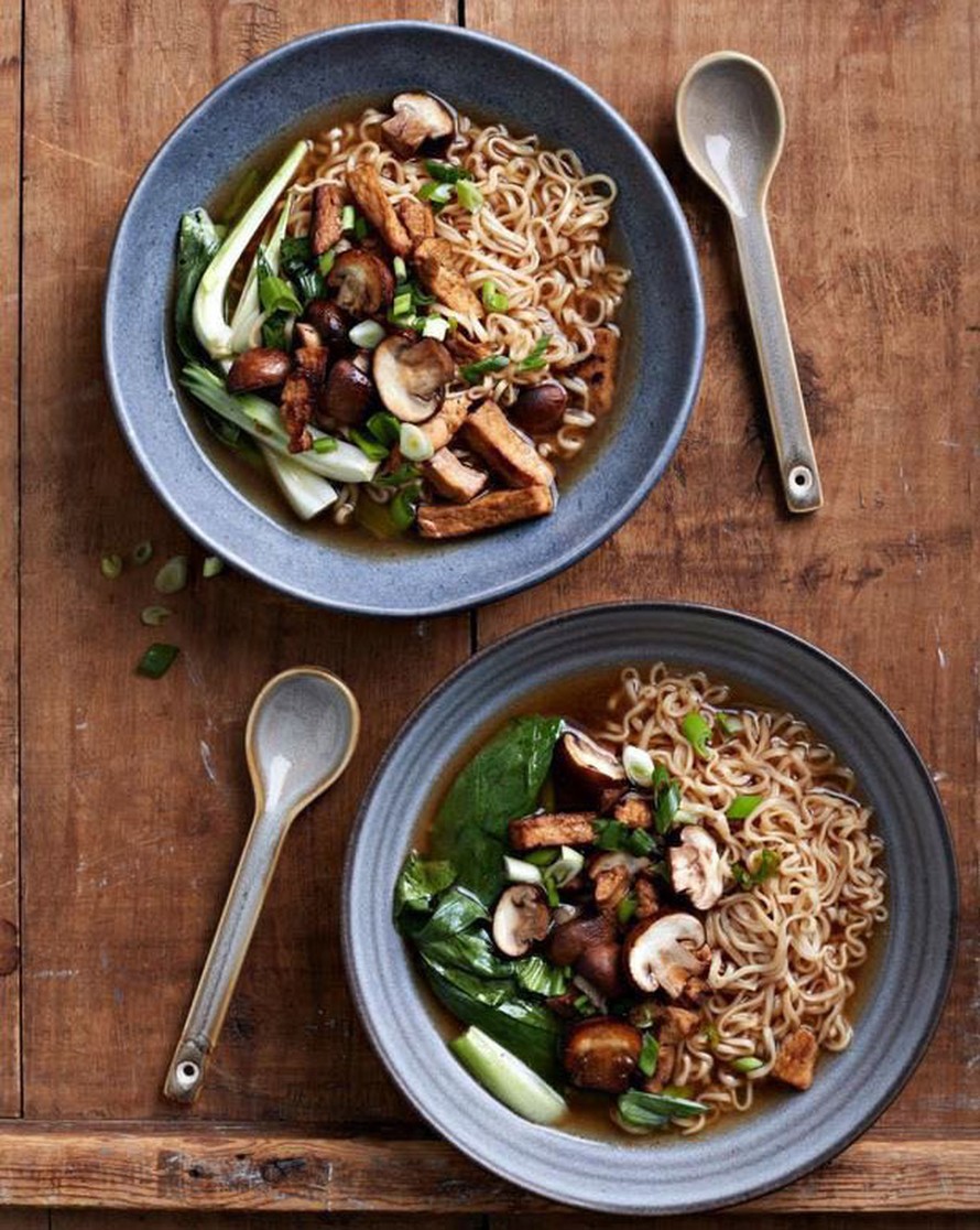 Nuudelipussista syntyy miniajassa ruokaisa soppa. Mausta liemi valmiilla mausteilla, paista herkkusieniä ja tofua pannulla ja upota paksoit kuumaan liemeen. Jos et löydä paksoita, pilko mukaan kiinankaalia tai höylää rapeaa valkokaalia.