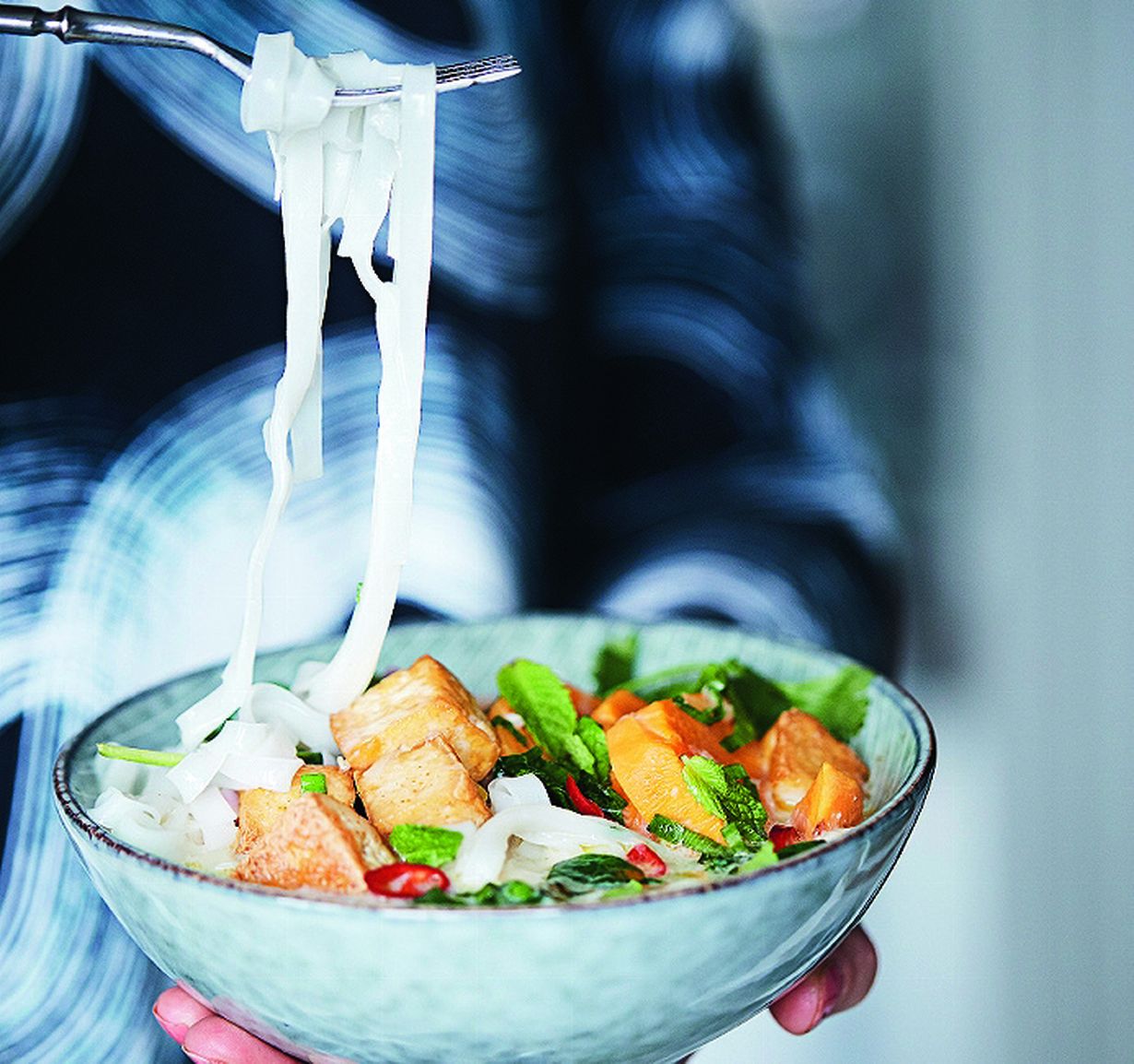 7. Jaa nuudelit kulhoihin ja kauho kuumaa keittoa päälle. Viimeistele annokset tofulla, yrteillä ja halutessasi hienonnetulla chilillä.