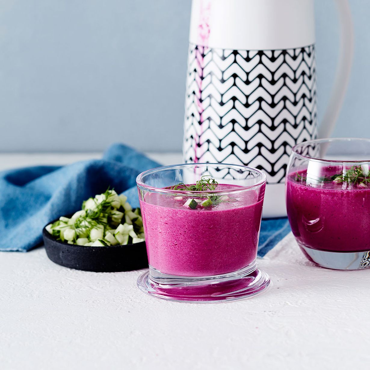 - Mittaa keiton aineet tehosekoittimeen ja soseuta tasaiseksi seokseksi. Maista ja lisää tarvittaessa suolaa. Siirrä keitto jääkaappiin jäähtymän ja maustumaan noin tunniksi.