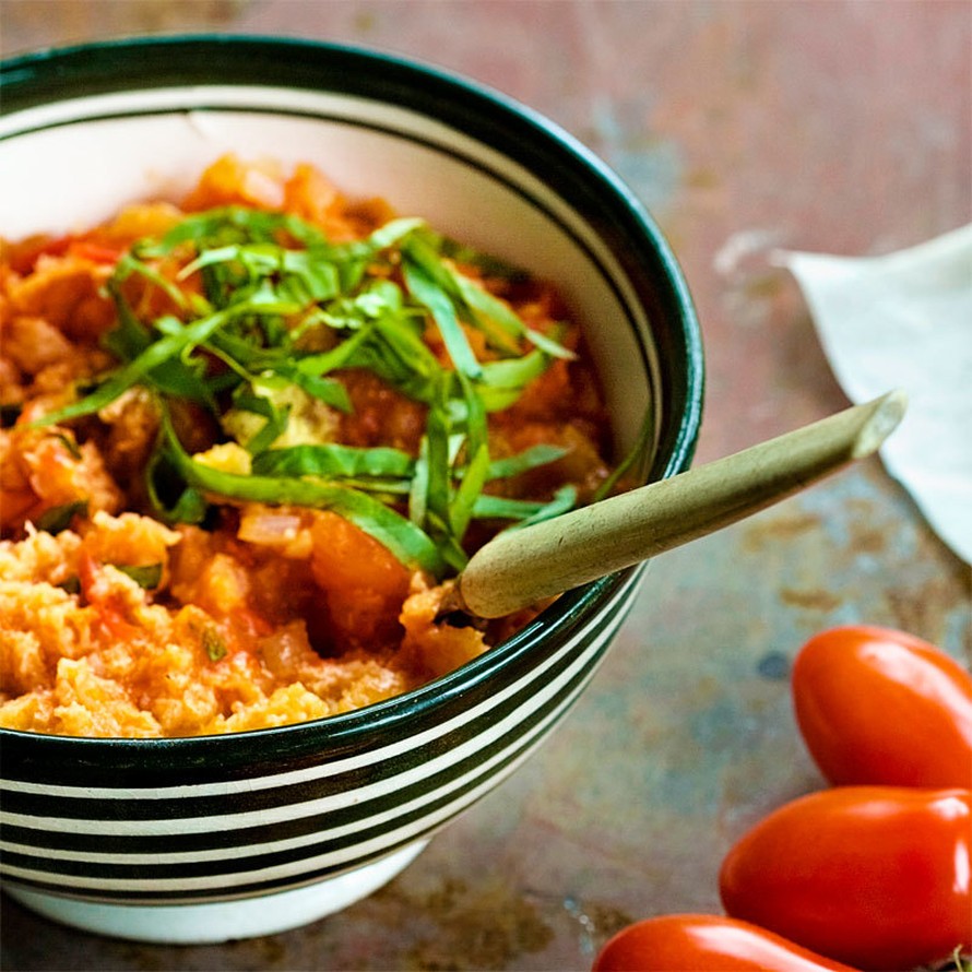 Mausteinen paksu tomaattikeitto saa makunsa basilikasta ja valkosipulista.