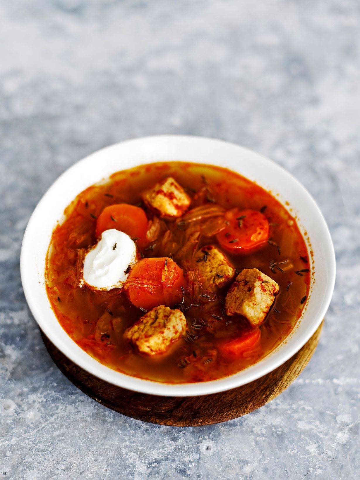 - Annostele keitto lautasille ja lusikoi ranskankermaa päälle.