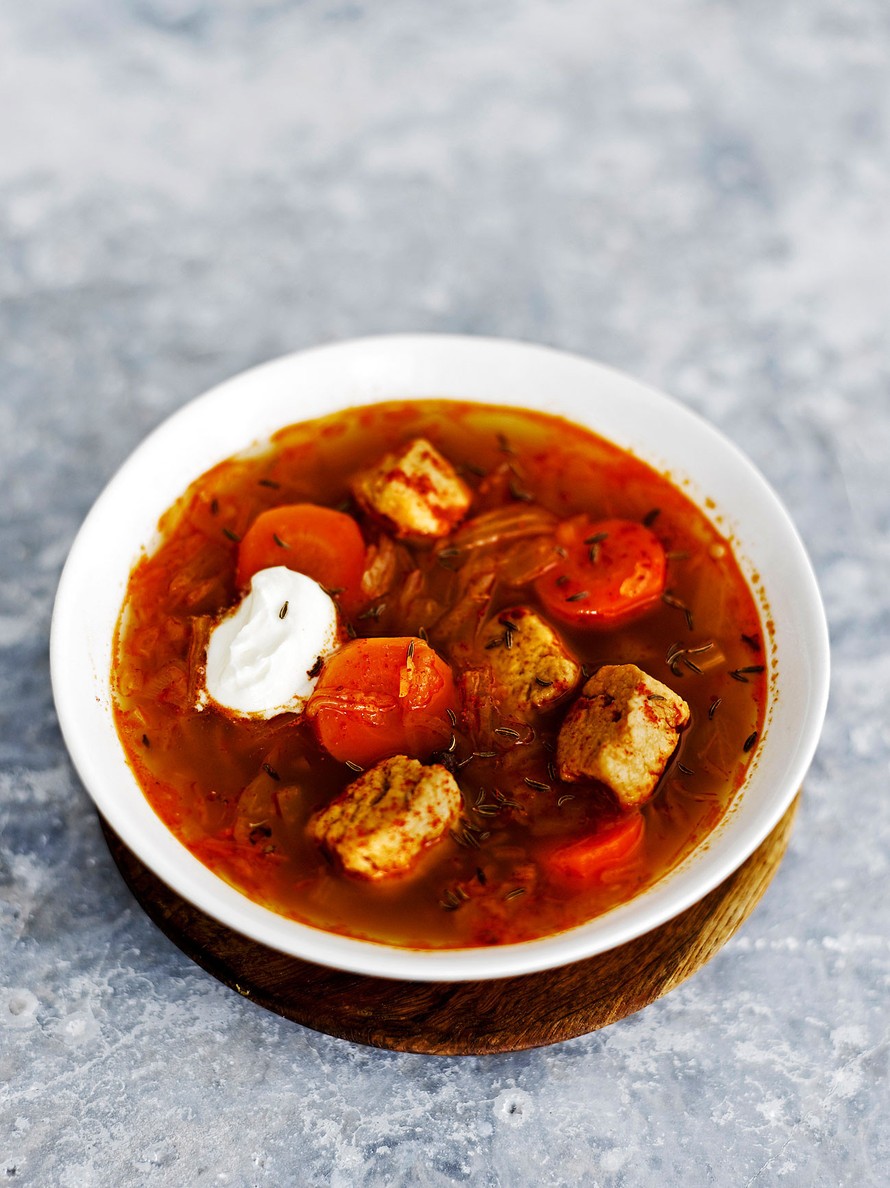 Proteiinipitoisella quornilla vahvistettu hapankaaligulassi on superhelppo kasvisruoka. Hapankaalissa on paljon edullisia vitamiineja. Vatsa kiittää.