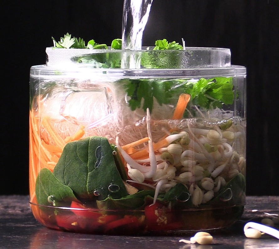 - Kuumenna vesi ja kaada purkkiin. Sulje kansi ja ravista. Anna keiton hautua 5 minuuttia.