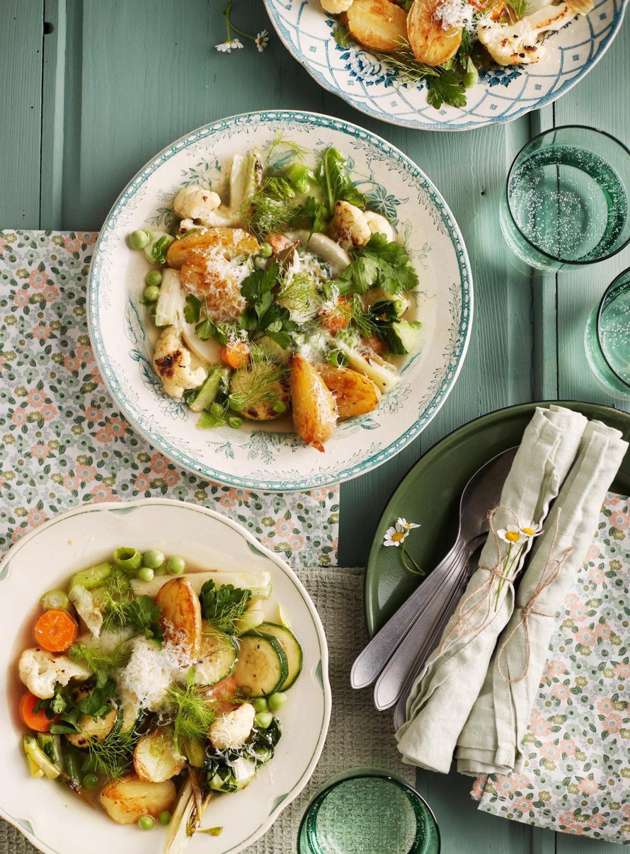 Keitä ensin maukas liemi, jolle parmesaanin kannikka antaa ihanan täyteläisen maun. Kauho sitten lautaselle kasapäin kypsennettyjä ja tuoreita vihanneksia.