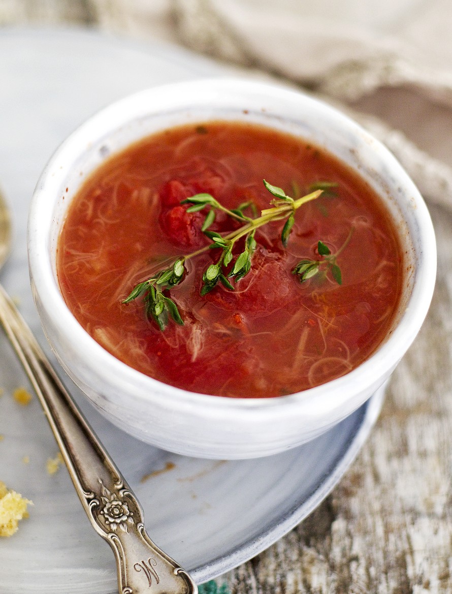 Juuri sopivan punaisessa keitossa hyödynnetään kesän lämmössä vihdoin maukkaiksi kypsyneitä kotimaisia tomaatteja sekä kesän viimeiset raparperinvarret. Raparperi toimii yllättävän hyvin tomaatin kanssa ja antaa keitolle hauskaa rakennetta. Tuoreet tomaatit kannattaa kuitenkin kaltata, jotta niiden kuorista ei jää ikäviä sattumia keittoon.