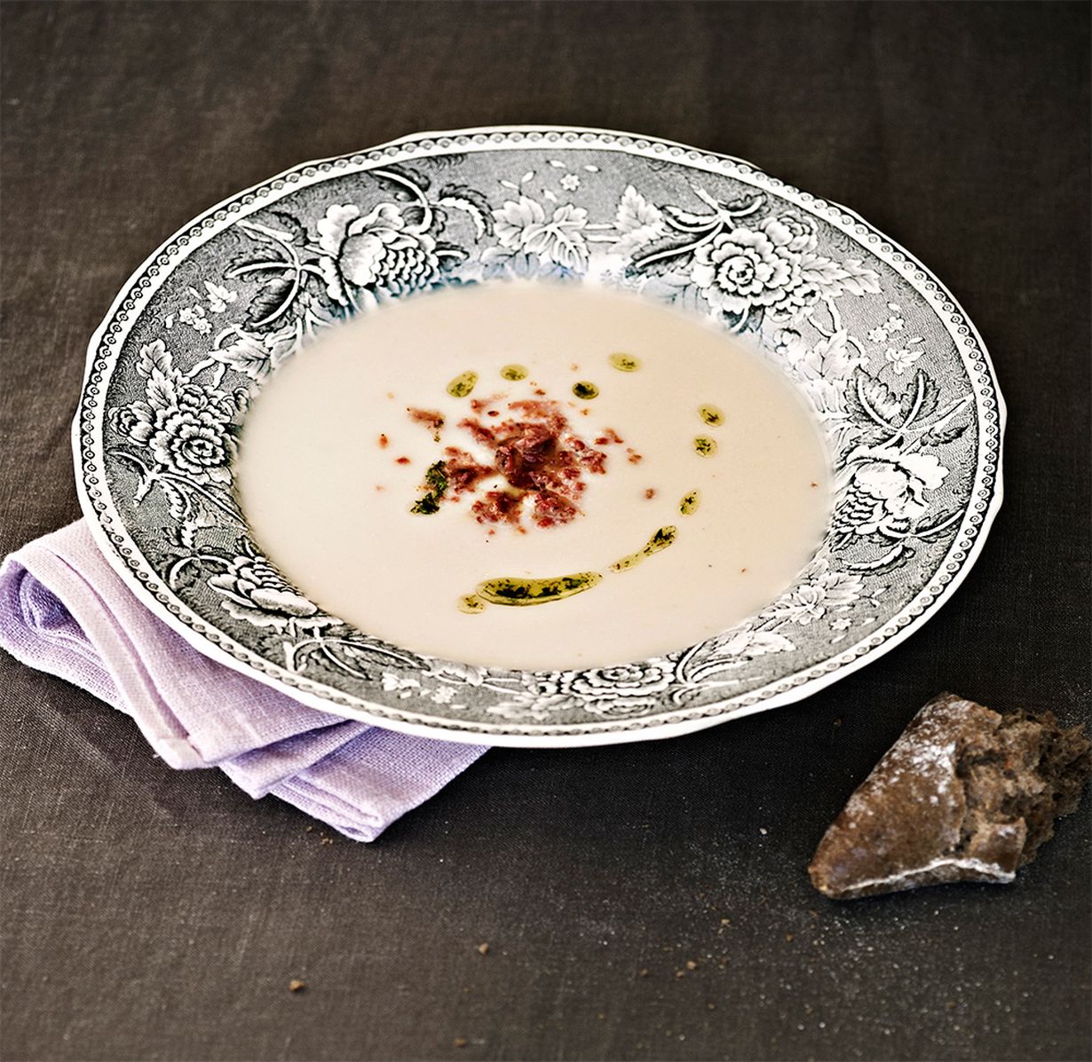 Vinkki! Murskaa 3 rkl tuoretta timjamia morttelissa ja lisää 3 rkl tryffeliöljyä. Koristele keitto sillä. Myös lusikallinen pannulla rapeaksi paistettua ja jäähtyneenä rouhittua parmankinkkua sopii keiton päälle.