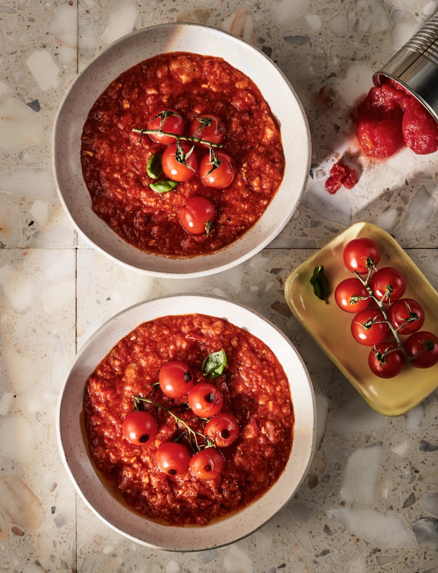 Oliiviöljy on tomaattikeiton silkinpehmeän suutuntuman salaisuus. Ennen tomaattisesonkia keitto valmistuu säilötyistä tomaateista.