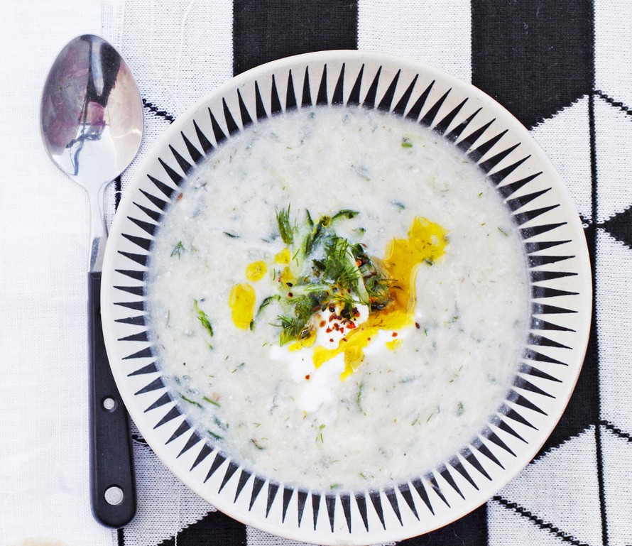 - Valmista tsatsiki juuri ennen tarjoilua. Raasta kurkku karkeaksi ja painele ylimääräinen neste pois raasteesta siivilässä. Sekoita raaste ja tillisilppu jogurttiin ja lisää murskattu valkosipulinkynsi. Mausta suolalla, tarjoa keiton kanssa.
