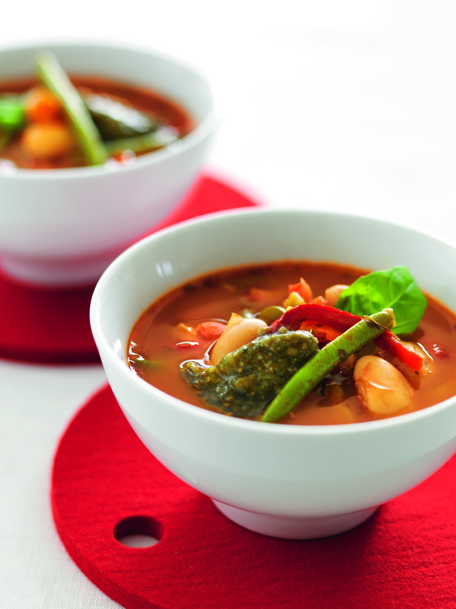 - Mittaa kulhoon kaikki muut pistoun ainekset paitsi öljy. Hienonna sauvasekoittimella ja lisää öljyä hiljalleen niin, että saat tahnamaisen seoksen. Tarjoile keitto tuoreen pistoun kera. Voit käyttää myös kaupan valmista pestokastiketta.