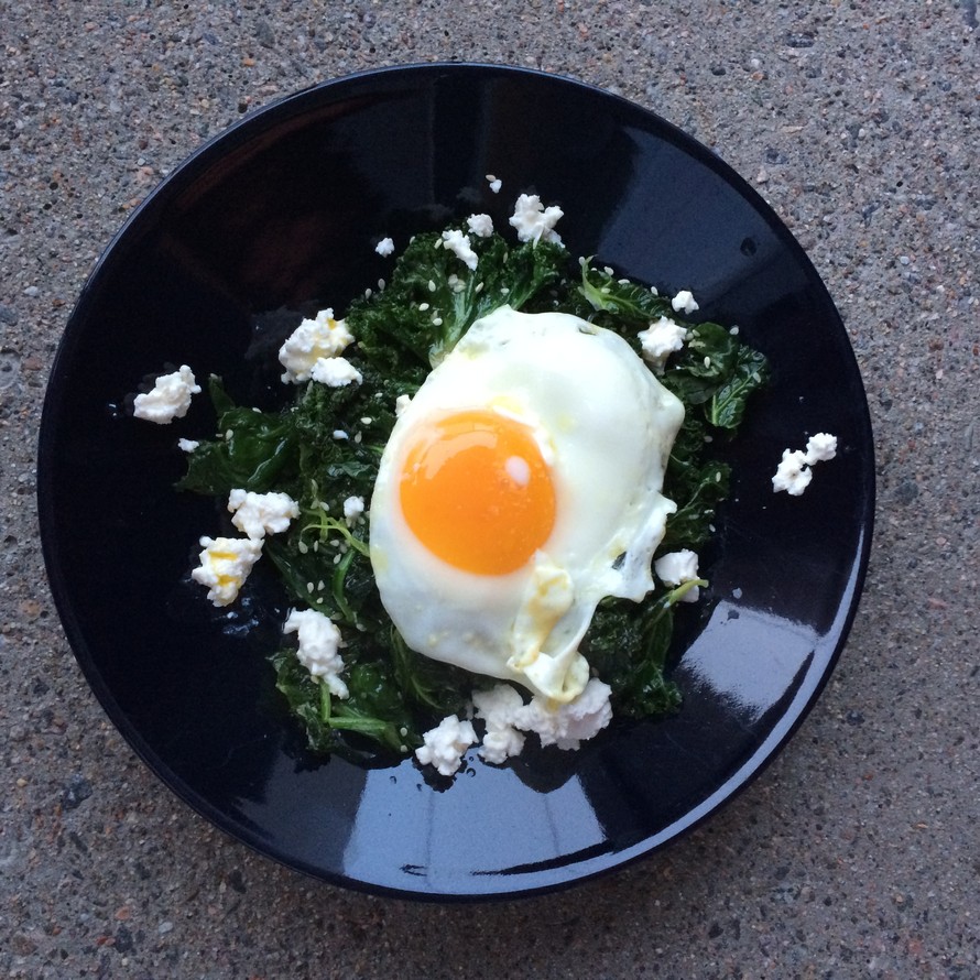 - Kun vihanta höyryttyy, paista toisessa pannussa pari kananmunaa sunny side up eli vain toiselta puolelta. Keltuaisen pitäisi jäädä juoksevaksi.