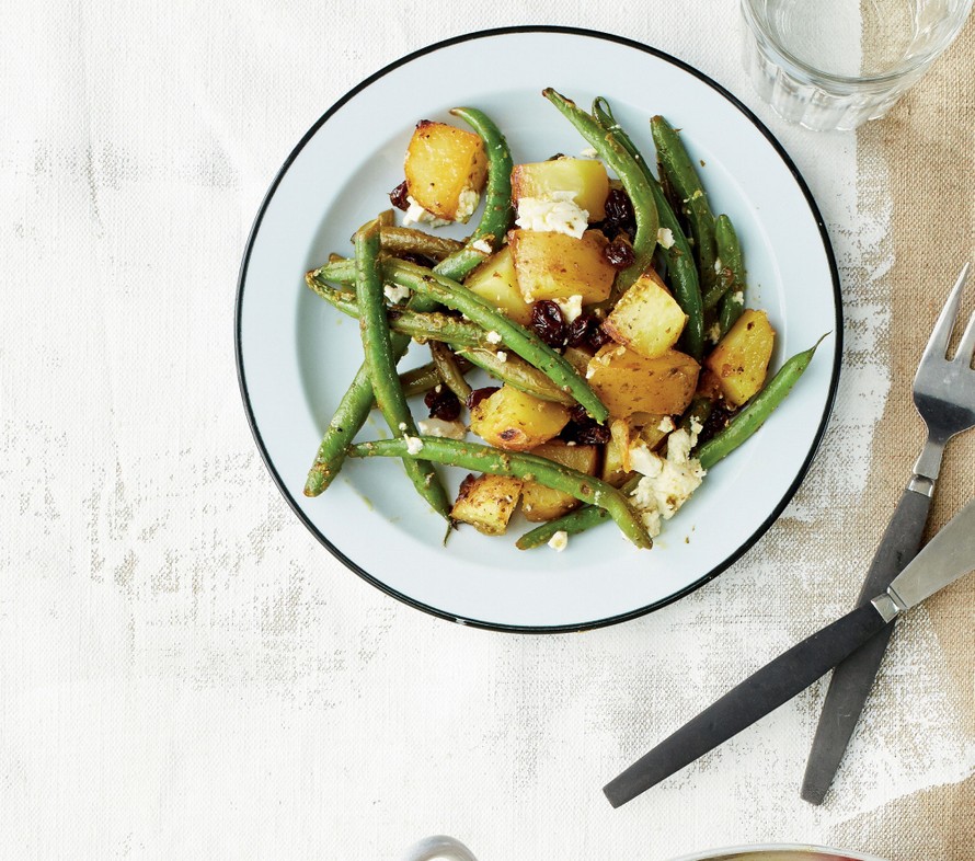 - Keitä vesi pannulla ja kypsennä siinä pavut, kunnes vesi on kokonaan haihtunut. Lisää joukkoon öljy ja perunat. Kääntele kasviksia öljyssä 5 minuuttia.