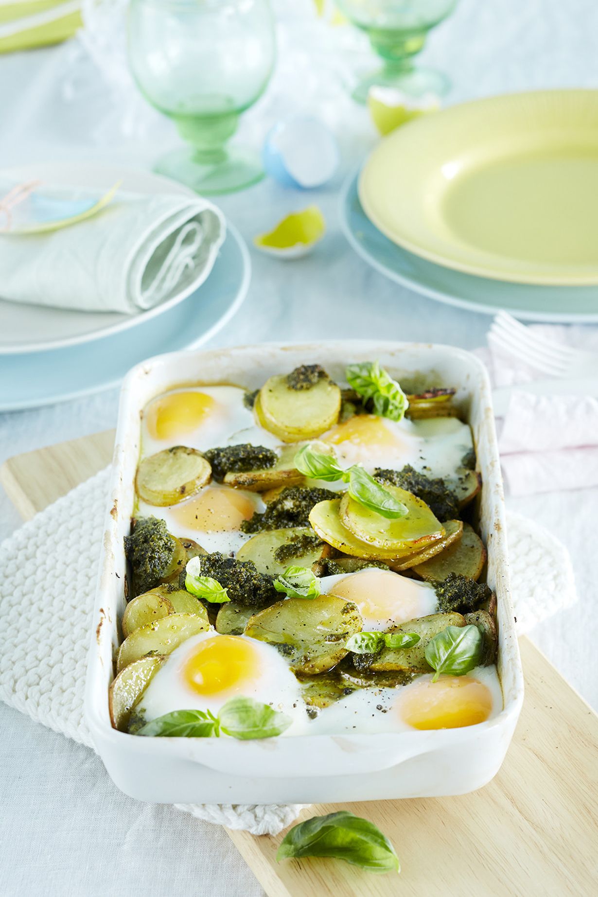 - Nosta vuoka uunista. Lusikoi pesto nokareina perunoiden päälle. Siirtele viipaleita hieman, jotta saat kuusi pientä syvennystä. Riko syvennyksiin munat.