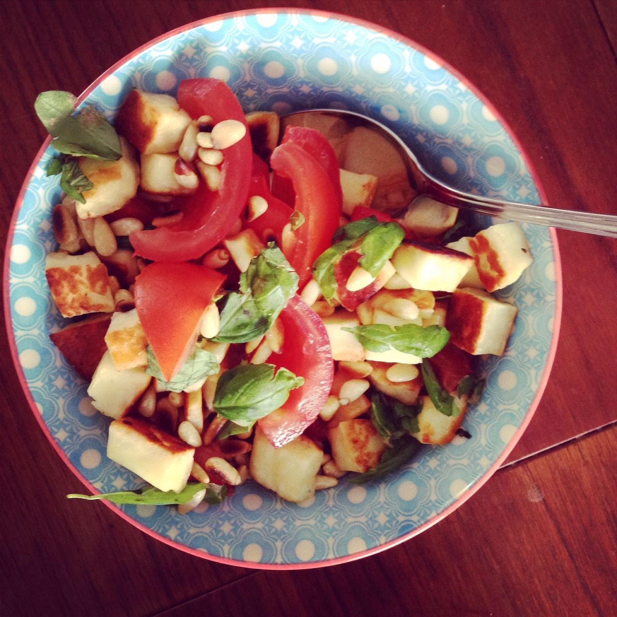 - Kuumenna paistinpannu ja paista halloumijuustoa molemmin puolin ruokalusikallisessa oliviöljyä niin, että se saa hyvin väriä pintaansa ja pehmenee. Ota sivuun lautaselle.