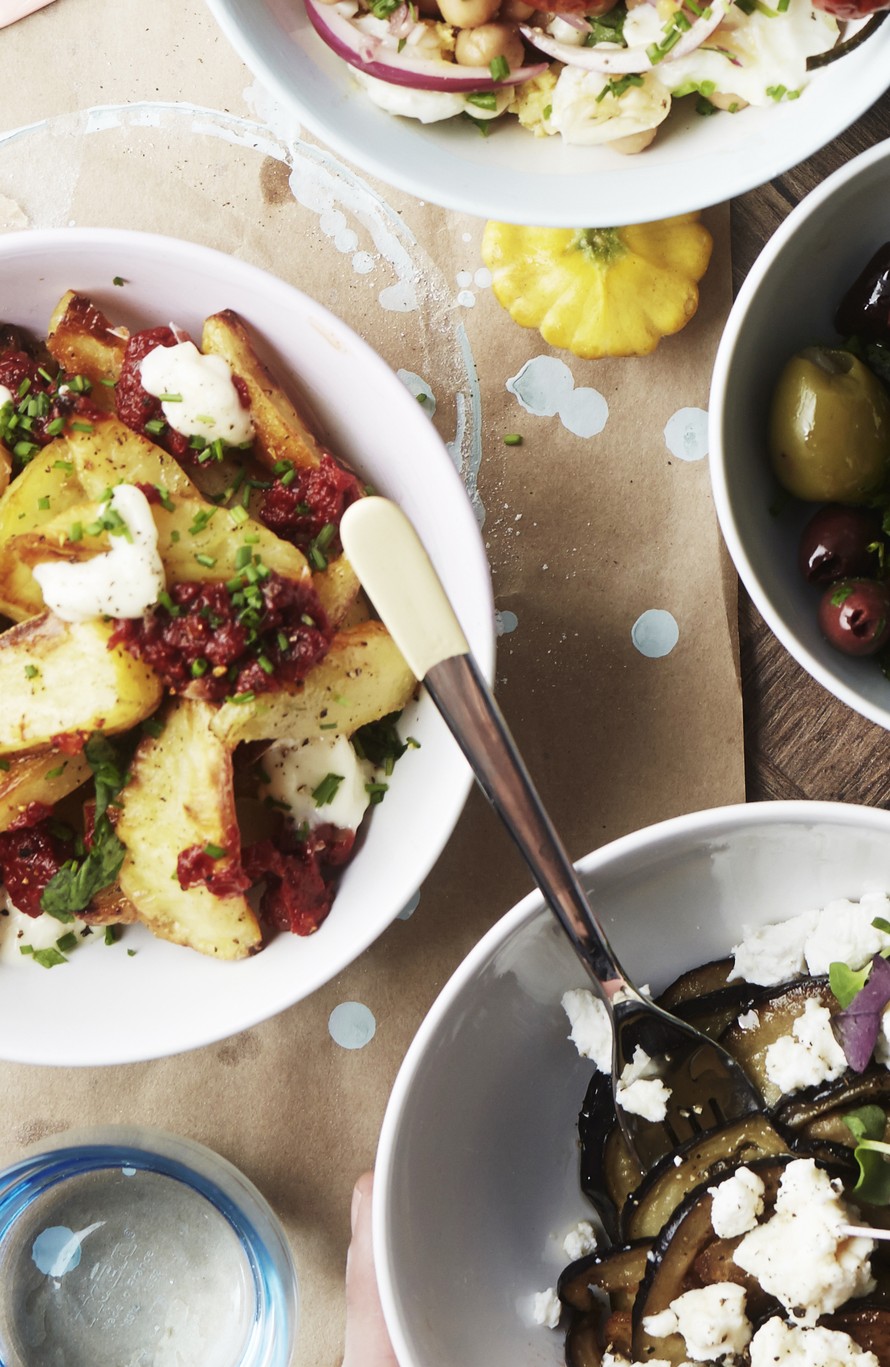 - Tarjoa perunat lämpimän kastikkeen ja valkosipulimajoneesin kanssa.