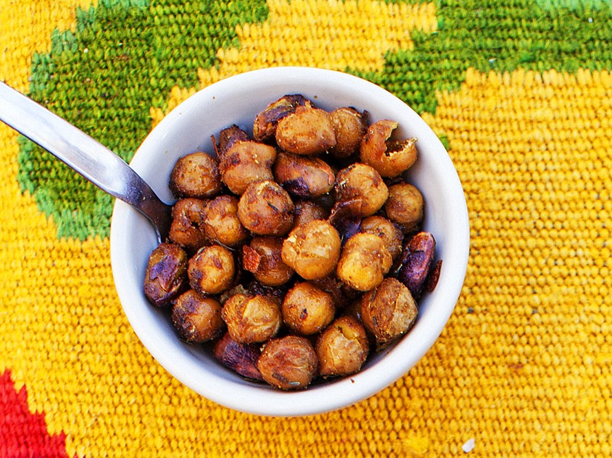 Rapeaksi paahdetut kikherneet ovat saaneet maustekuorrutuksen.