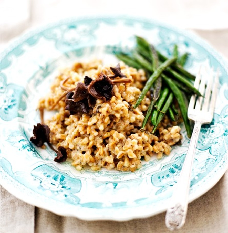 - Sulata voi kattilassa. Lisää kerma, pikkelssiliemi ja mausteet. Murskaa sekaan kuivat sienet. Kaada spelttijyvät kattilaan, sekoita ja kiehauta, kunnes risotto on kermaisen samettista. Purista joukkoon sitruunan mehu. Tarjoa papujen ja sienipikkelssin kera.