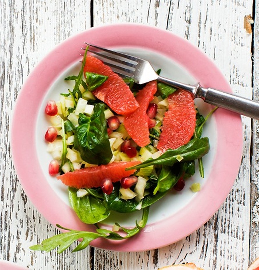 - Leikkaa fenkoli pieniksi kuutioiksi. Sekoita kastikkeen ainekset yhteen ja kumoa fenkolikuutioiden päälle. Hienonna persilja joukkoon. Levitä pinaatti tarjoilulautaselle. Lusikoi fenkolikuutiot pinaatille. Nosta greippilohkot ja rucolanlehdet päälle. Irrota granaattiomenasta siemenet ja koristele niillä salaatti.
