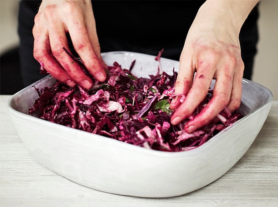 - Yhdistä kaali, sipuli ja punajuuret kulhossa. Lisää kastike ja sekoita. Murusta feta salaattiin juuri ennen tarjoilua. Hienonna korianteri salaatin koristeeksi.