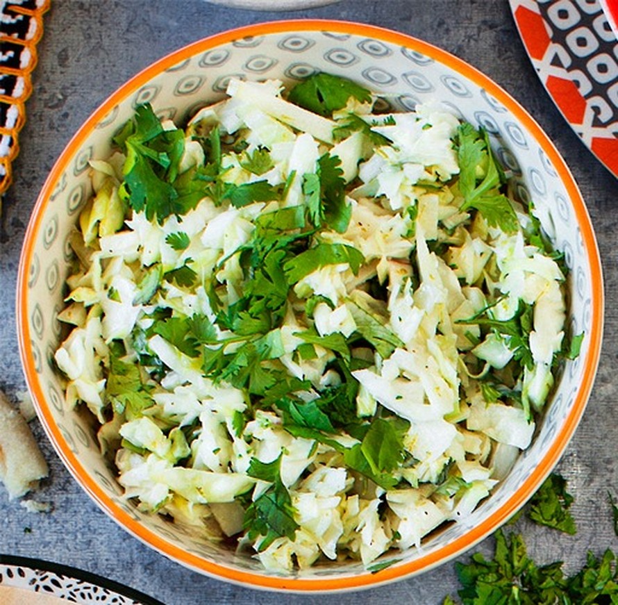 Kaali-omenasalaatissa maistuu korianteri.