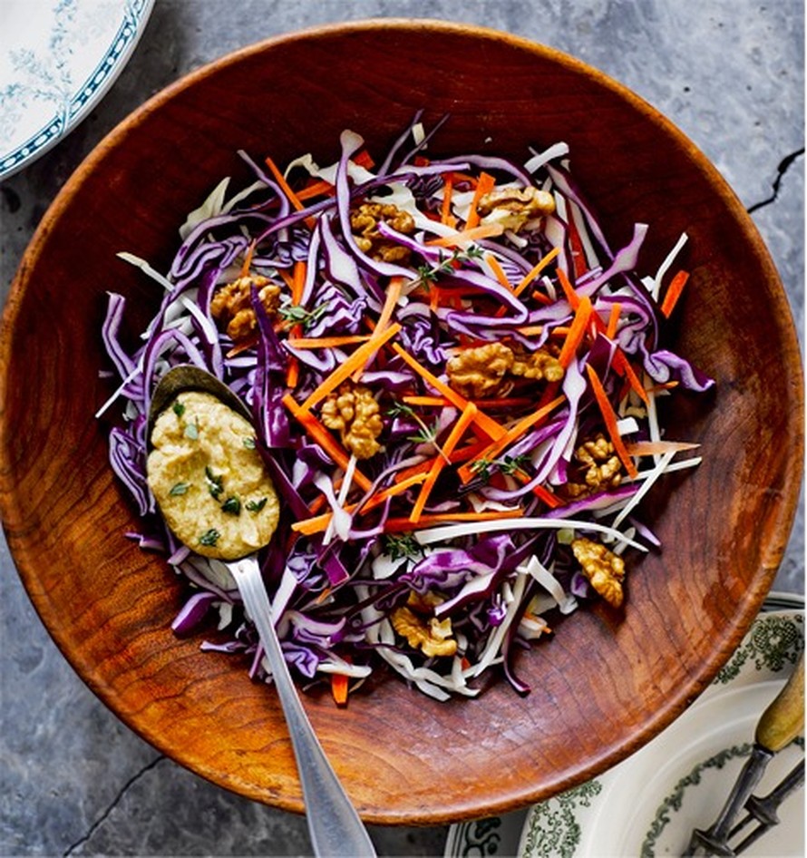 Maapähkinäkastike maustaa kaali-juuressalaatin.