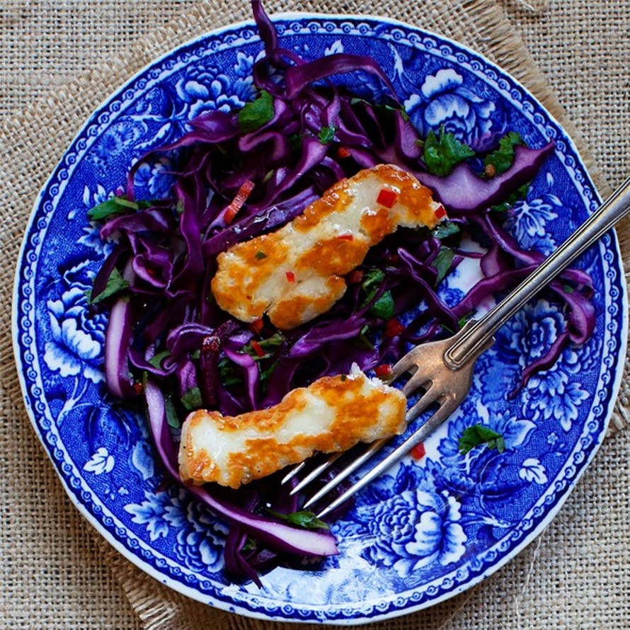 - Leikkaa halloumi-juusto noin puolen sentin viipaleiksi. Paista viipaleet pannulla molemmin puolin. Nosta lämpimät juustoviipaleet kaalisalaatin pinnalle.