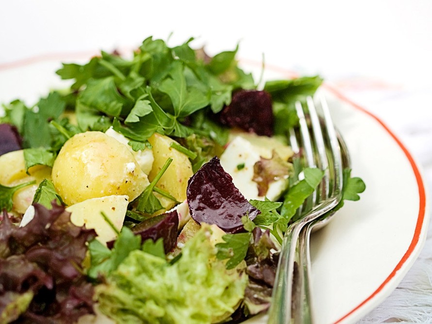 - Kun punajuuret ovat kypsiä, kuori ja lohko ne. Leikkaa myös perunat lohkoiksi. Leikkaa feta kuutioiksi ja hienonna persilja. Yhdistä perunat, salaatti, feta ja persilja. Lisää kastike ja sekoita.