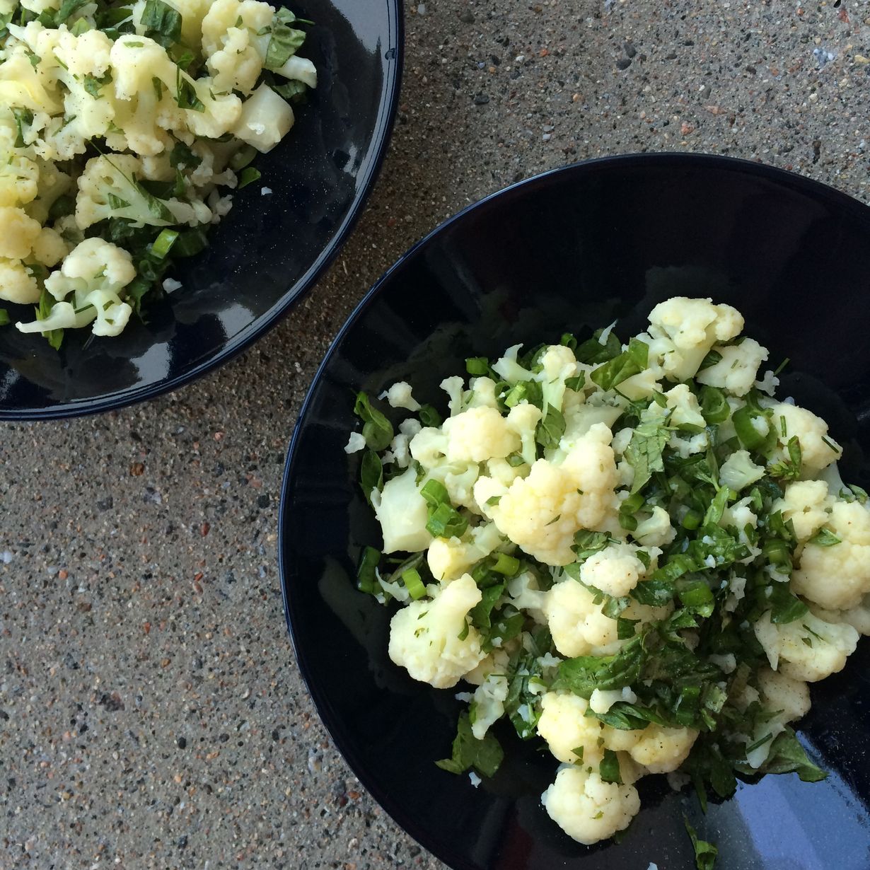 Tämä kukkakaalisalaatti on todella simppeli; kaalinnuput keitetään napakoiksi ja sitten niihin sekoitetaan kirpeää sitruunakastiketta. Lopuksi salaatti viimeistellään silputuilla yrteillä ja sipulinvarsilla. Ruohosipulikin käy.