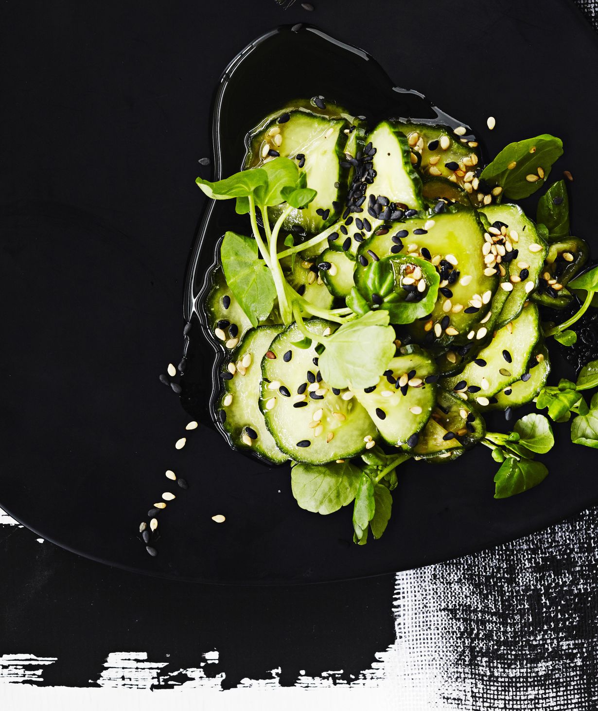 - Valuta kurkut siivilässä ja siirrä ne takaisin kulhoon. Kumoa kastike kurkkujen päälle, sekoita ja nosta tarjolle. Ripottele pinnalle loput seesaminsiemenet ja koristele vesikrassilla.