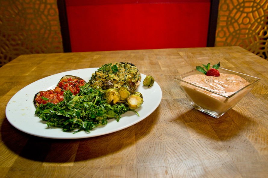 Manuela Boscon kasvislautasella riittää herkkuja: paahdettuja sieniä yrtti-kvinoan kanssa, ruusukaalia, munakoisoa tomaattipedillä ja hierottua lehtikaalisalaattia.