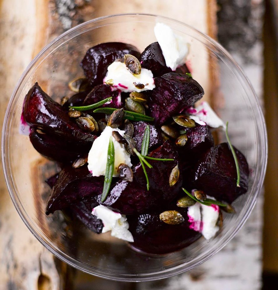 - Paahda kurpitsansiemenet tällä välin kuumalla, kuivalla pannulla. Nosta lohkot tarjoiluastiaan ja laita päälle vuohenjuustonokareita. Koristele kurpitsansiemenillä.