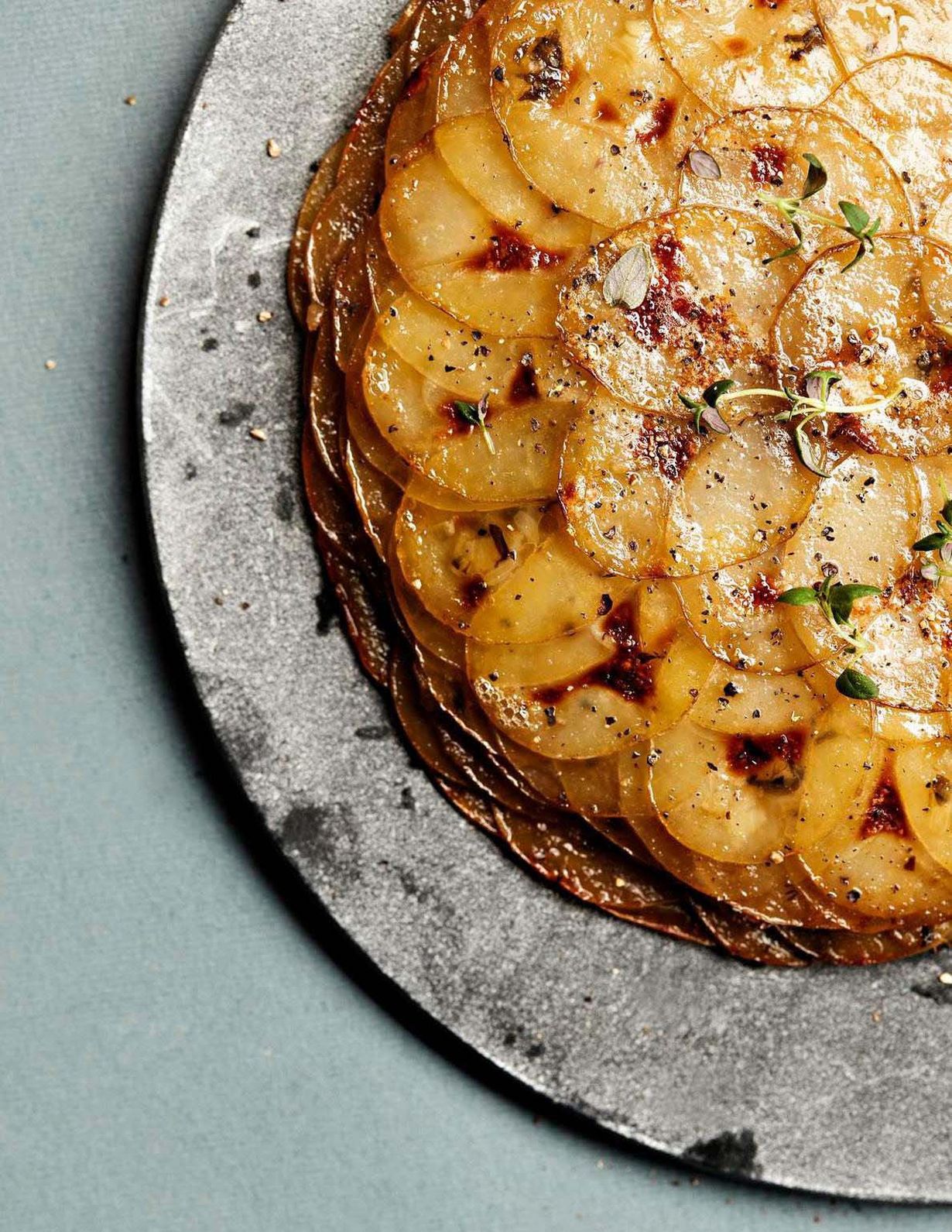 Kaikki lähtee ohuen ohuiksi leikatuista perunaviipaleista, joiden tekemiseen mandoliini on paras väline. Viipaleet ladotaan kakkuvuokaan kerroksittain mausteiden ja tiiviiksi keitetyn, timjamisen kanaliemen kanssa. Huomaa, että irtopohjavuokaa ei kannata käyttää, sillä maukas liemi valuu sen liitoksista läpi.