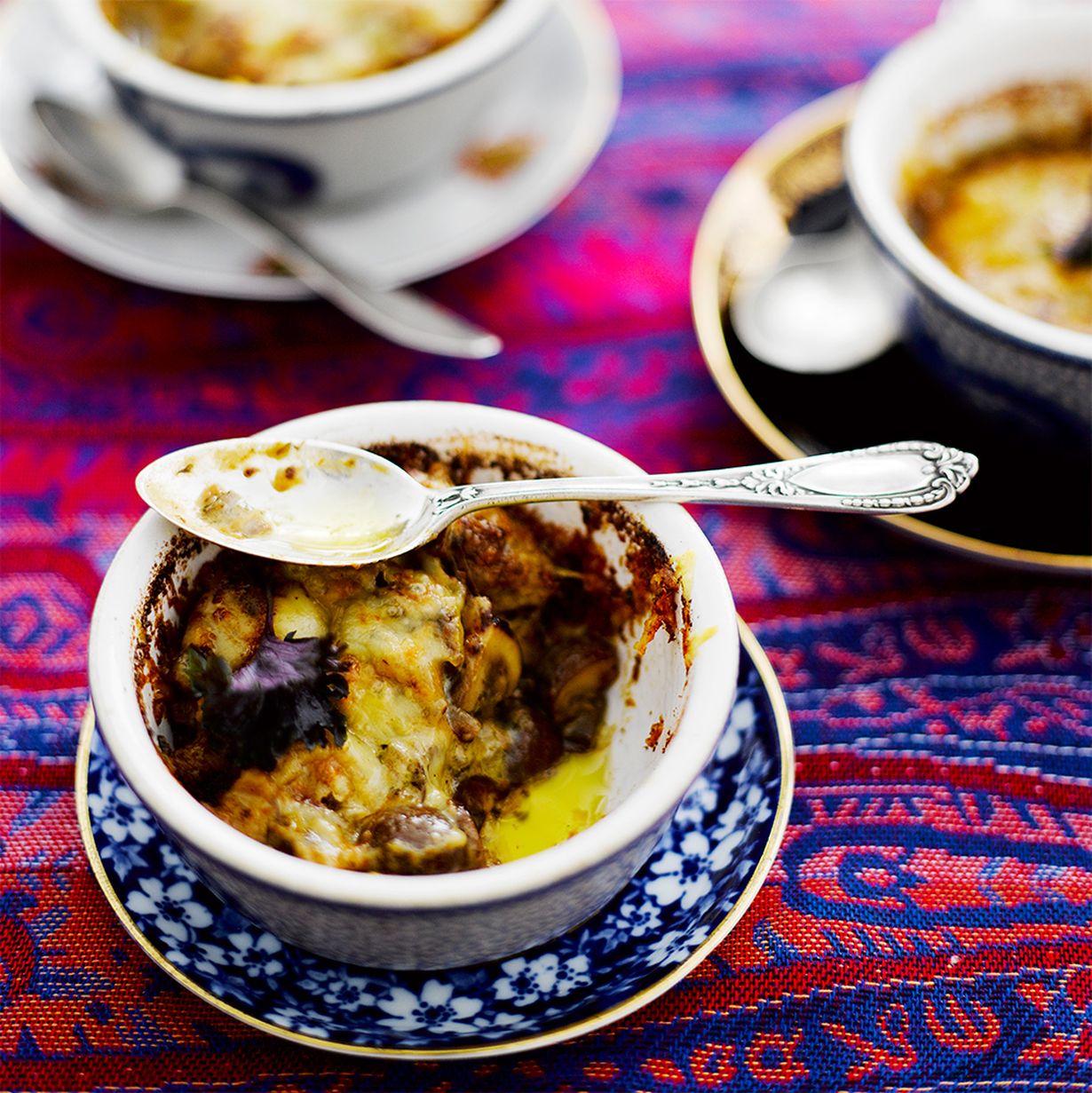 - Annostele ruoka pieniin, voideltuihin annosvuokiin. Ripottele päälle reilusti juustoraastetta. Ruskista 225 asteessa uunin ylätasolla noin 5 minuuttia tai kunnes juustokuorrutus on ruskeaa ja rapeaa. Tarjoa alkupalana tai illanistujaisherkkuna salaatin ja leivän kanssa.