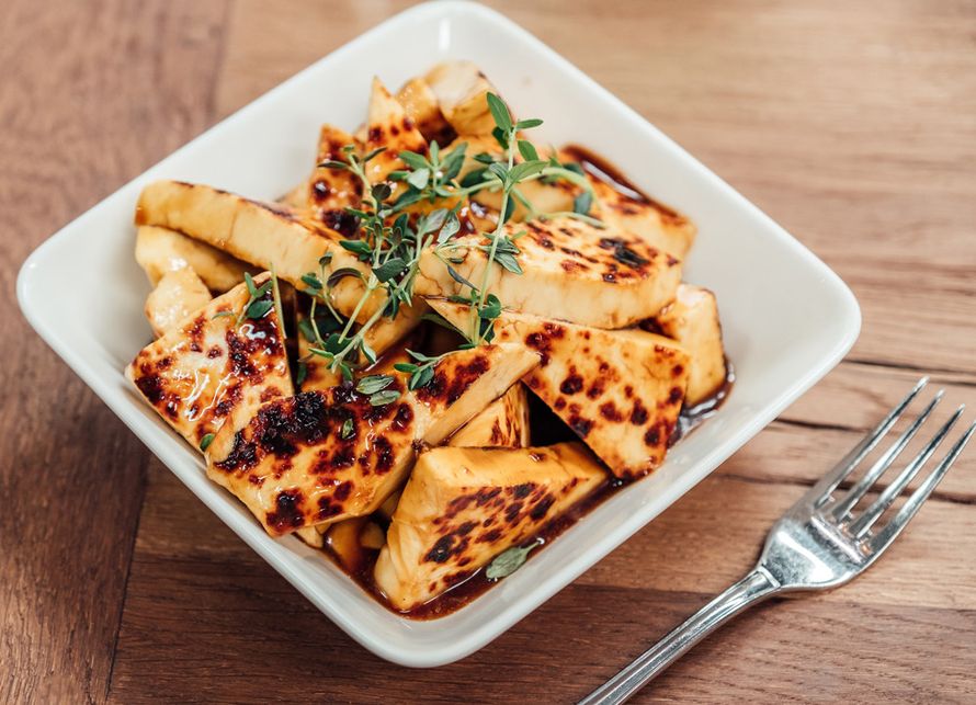- Leikkaa leipäjuusto annospaloiksi ja laita palat marinoitumaan siirappiin. Anna marinoitua noin puoli tuntia.