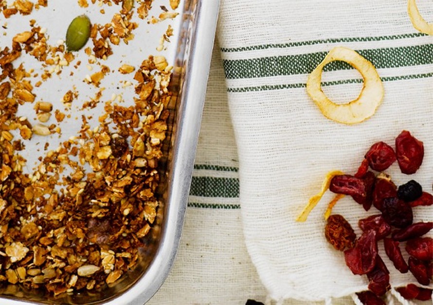 - Rouhi saksanpähkinät ja lisää ne siementen kanssa hiutaleisiin. Kaada seos uunipellille ja paahda uunissa 20–30 minuuttia. Sekoittele välillä. Granolaan saa paistua kullanruskea pinta. Anna granolan jäähtyä.