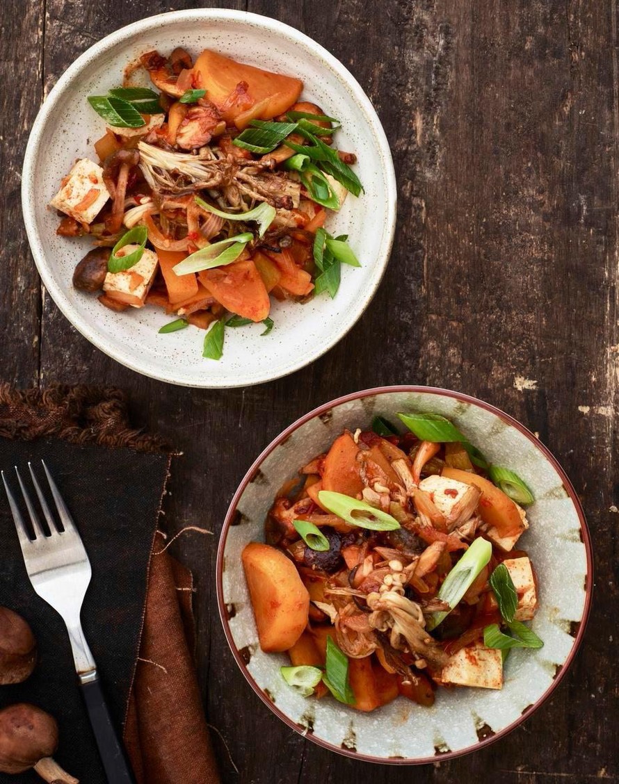 - Lisää kimchi, sipuli, nauris ja siitakesienet.