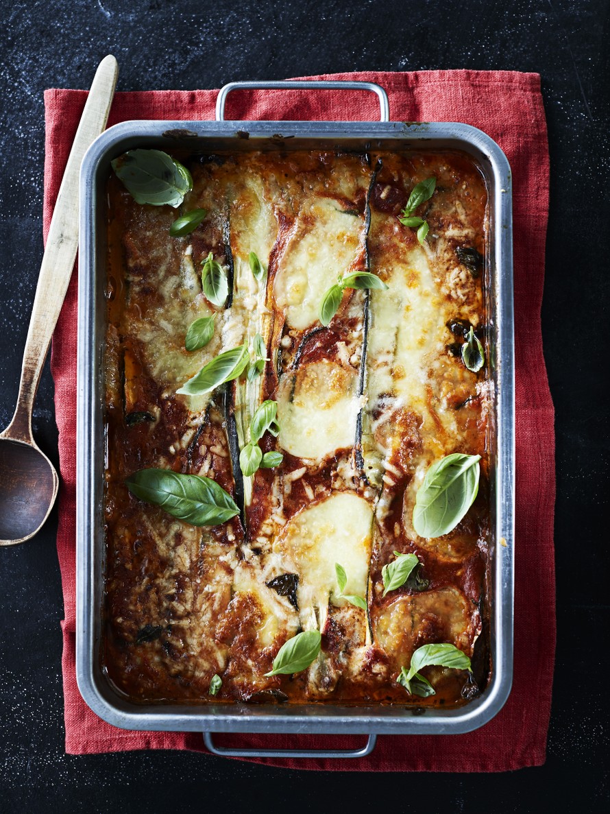 - Voitele uunivuoka (20 x 30 cm) öljyllä. Levitä ohut kerros kastiketta pohjalle. Levitä kerros kasviksia, basilikaa, kastiketta, mozzarellaa ja juustoraasteita päälle. Täytä loput kerrokset samalla lailla.