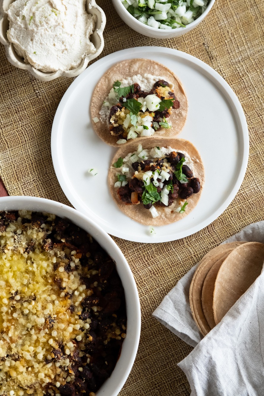 Tarjoa papupaistos heti lämpimien tortillojen, tortillasipsien, hienonnetun sipun, cashew creman ja tuoreen korianterin kanssa.