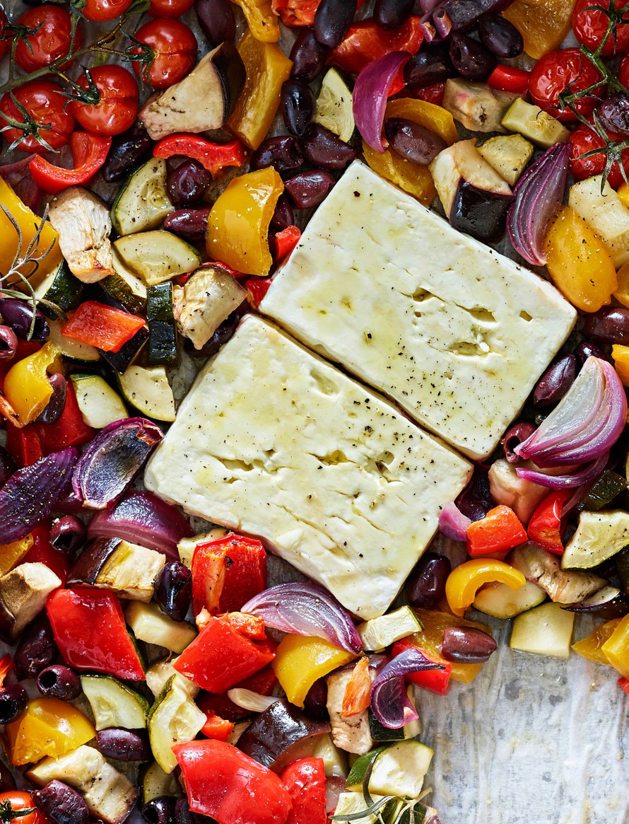 - Sekoita kaikki kasvikset uunipellillä. Mausta suolalla ja pippurilla ja valuta sitruunaöljy tasaisesti vihannesten päälle. Lisää rosmariini, oliivit ja lopuksi kokonaiset fetajuustot. Paista uunissa 45 minuuttia.