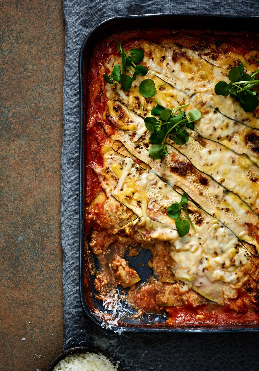 - Kaada ¼ paseeratusta tomaatista voideltuun uunivuokaan. Lado päälle kesäkurpitsaviipaleita ja lusikoi päälle”ricottaa”. Toista sama 3 kertaa niin, että ricotta jää päällimmäiseksi. Ripottele pinnalle oreganoa ja juustoraastetta.