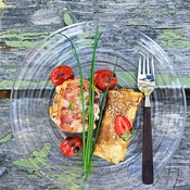 - Leikkaa kesäkurpitsat (tai munakoiso) ohueksi mandoliinileikkurilla tai veitsellä.