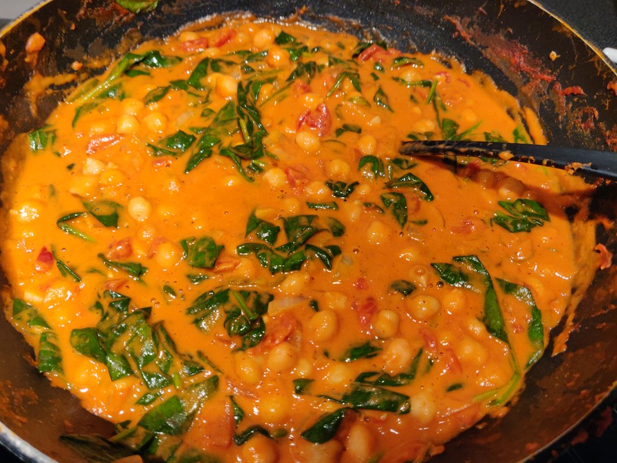 6. Sekoita kikherneet ja pinaatit kastikkeeseen ja anna kypsyä vielä 15-20 minuuttia.